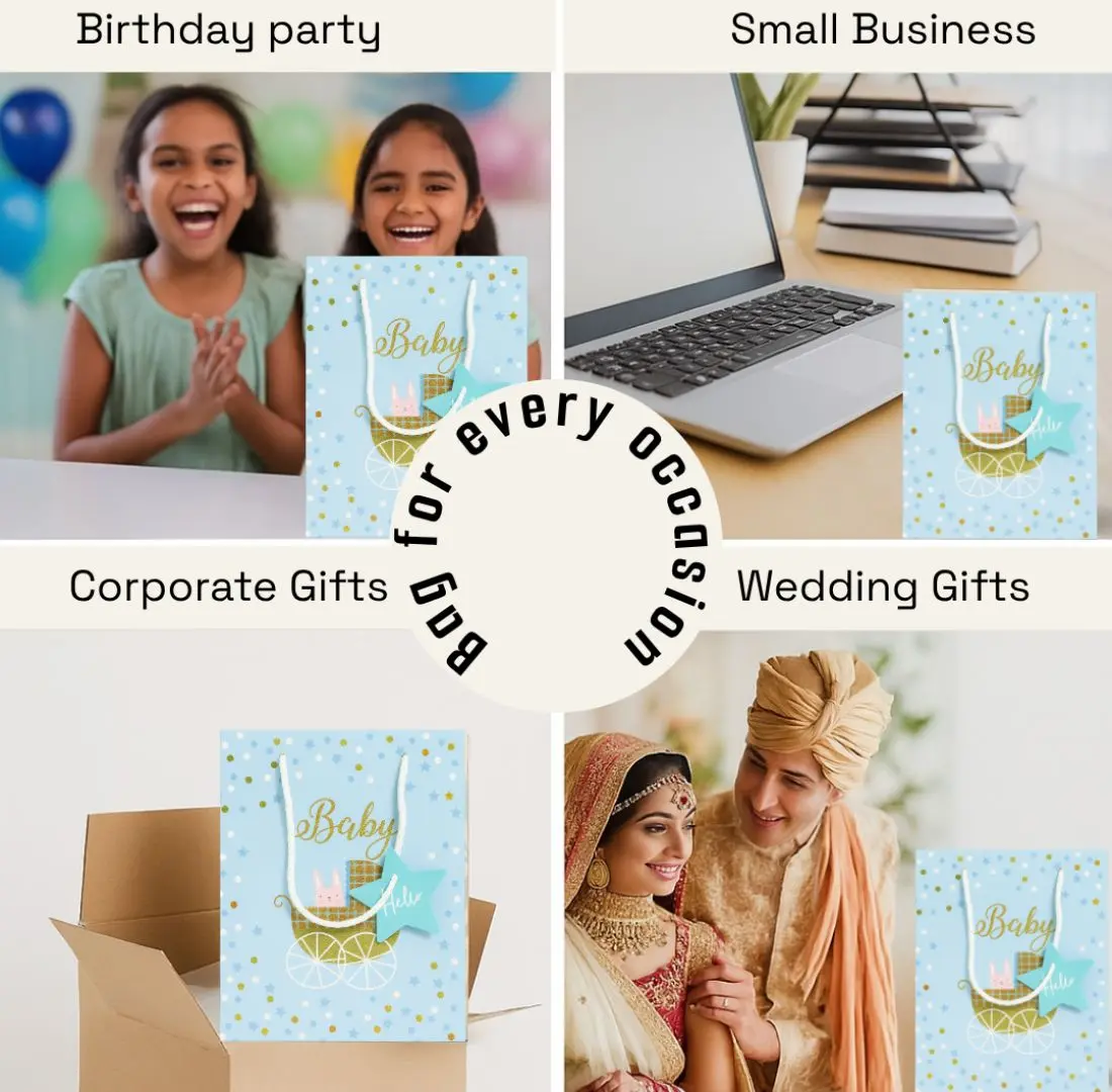 Celebrate your special moments with these adorable Baby Shower Gift Bags, designed with cute baby themes like animals, balloons, cars, and stars. Made from premium quality paper with sturdy rope handles, these bags are both durable and eco-friendly. Perfect for baby shower favors, return gifts, birthday parties, or newborn celebrations, they add a charming touch to your gifting experience. The glossy finish and pastel prints make them attractive and reusable, saving you the hassle of wrapping. Ideal for carrying chocolates, clothes, toys, or accessories, these decorative baby gift bags are a must-have for every baby shower or celebration.