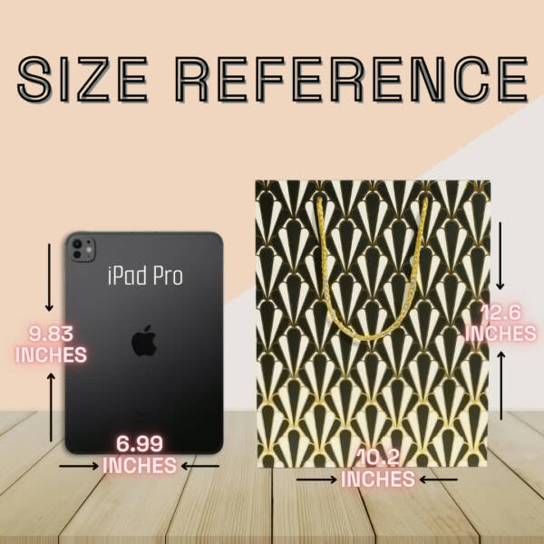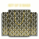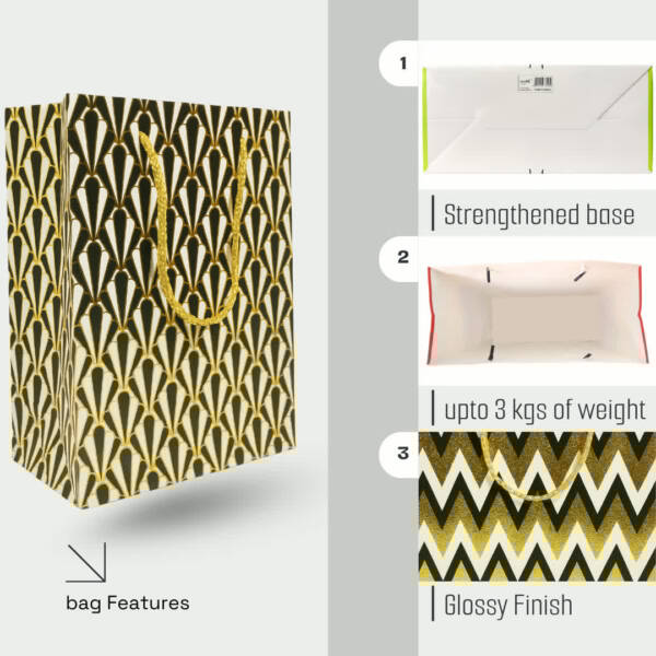 Bring elegance and style to your gifting with this Paper Gift Bags featuring Diamond, Fan, Chevron, and Scallop designs in classy black and gold. Made from durable eco-friendly paper with sturdy golden rope handles, these reusable carry bags are perfect for weddings, birthdays, parties, festivals, and return gifts. The glossy finish and modern geometric patterns make your presents look extra special without the need for wrapping. Ideal for gifting clothes, books, accessories, or party favors, these decorative bags combine strength, beauty, and sustainability—making them a must-have choice for every celebration.