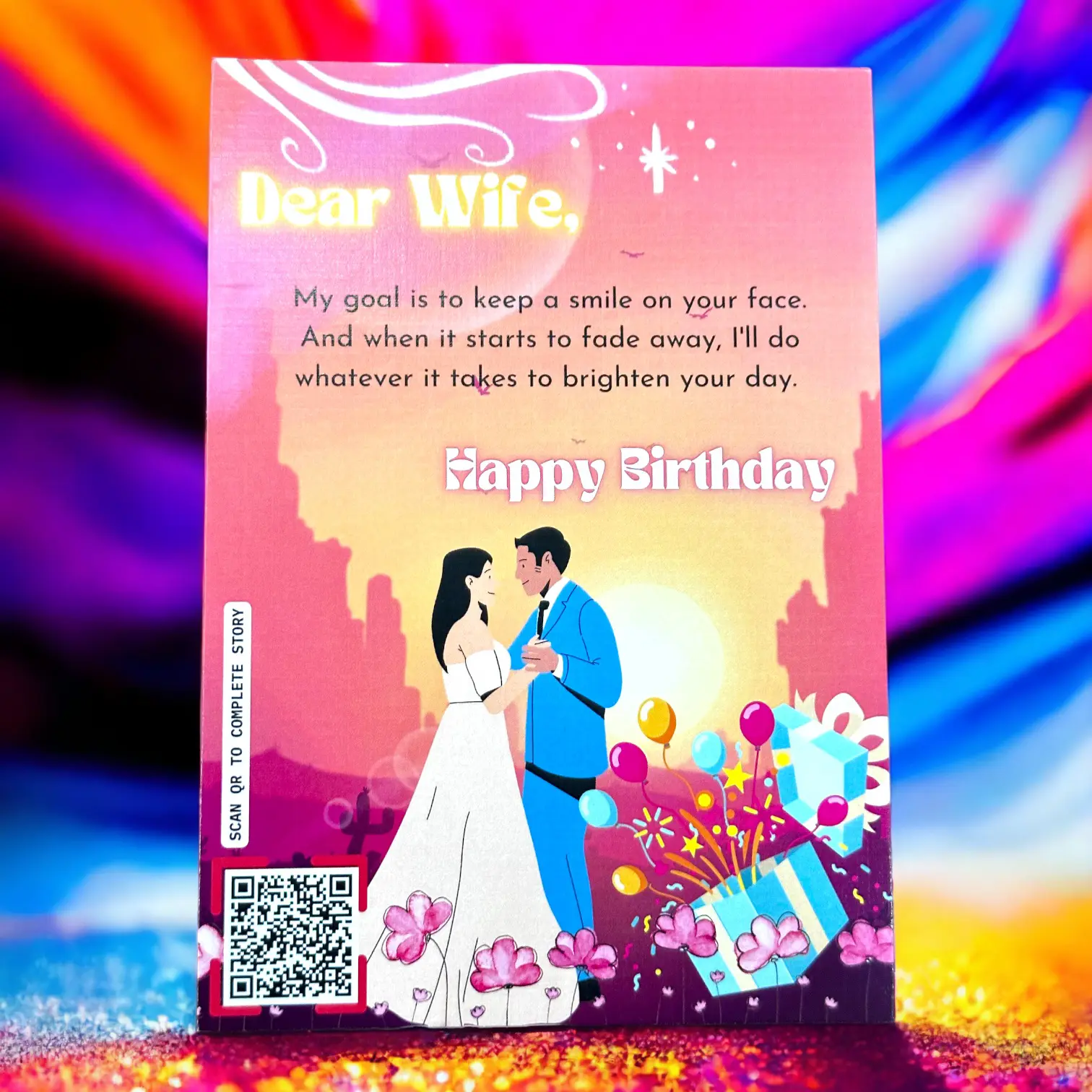 ๐ This gift for wife bday package has a Necklace, rings, bracelet, clutcher, earrings, and a Postcard & Interactive Message embedded as QRย on Postcard. She Receives the GIFT &