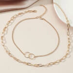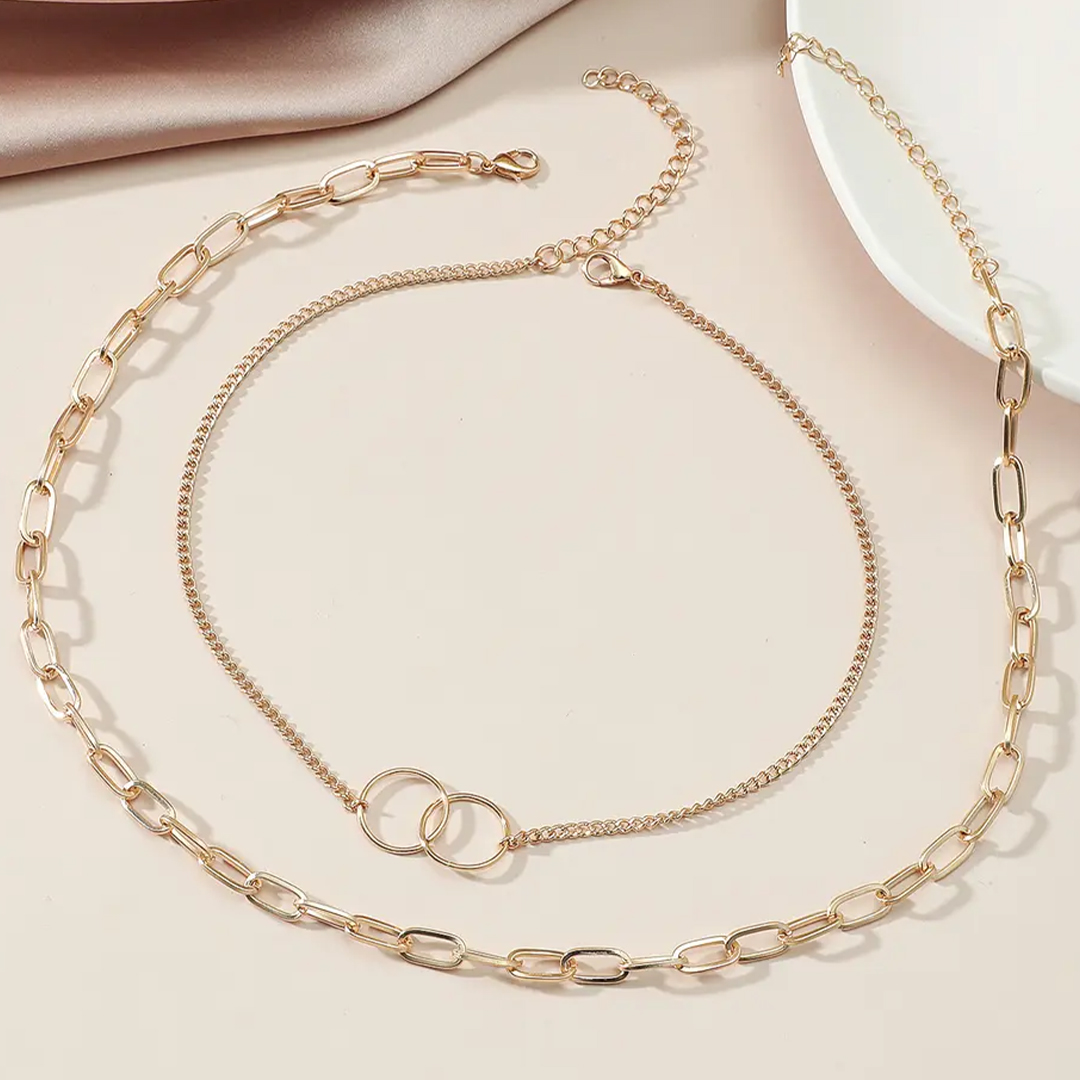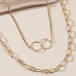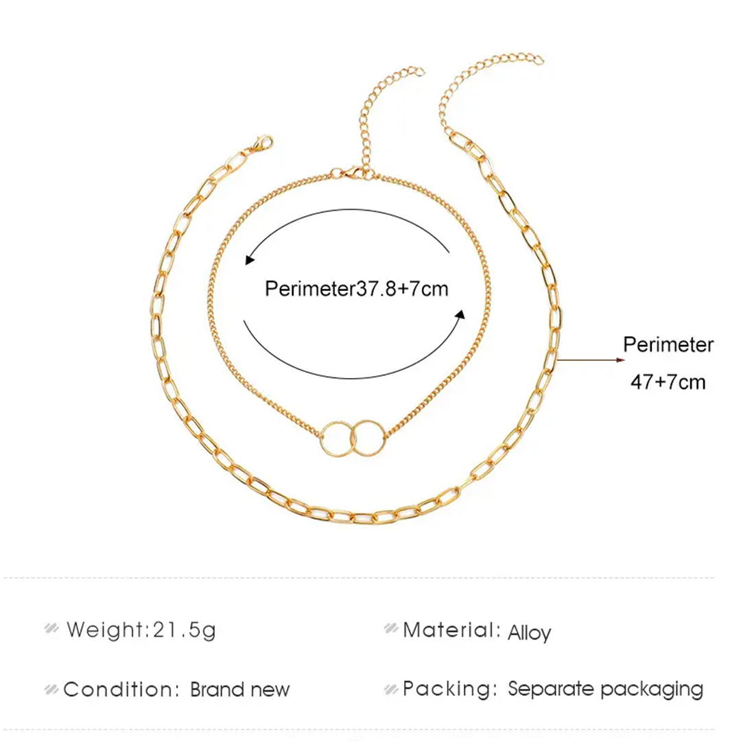 - The necklace features two distinctive chains that beautifully complement each other. The longer chain showcases a captivating cable link design, exuding a sense of strength and grace. At the heart of the shorter chain lies an interwoven arrangement of two rings, symbolizing unity and endless possibilities.