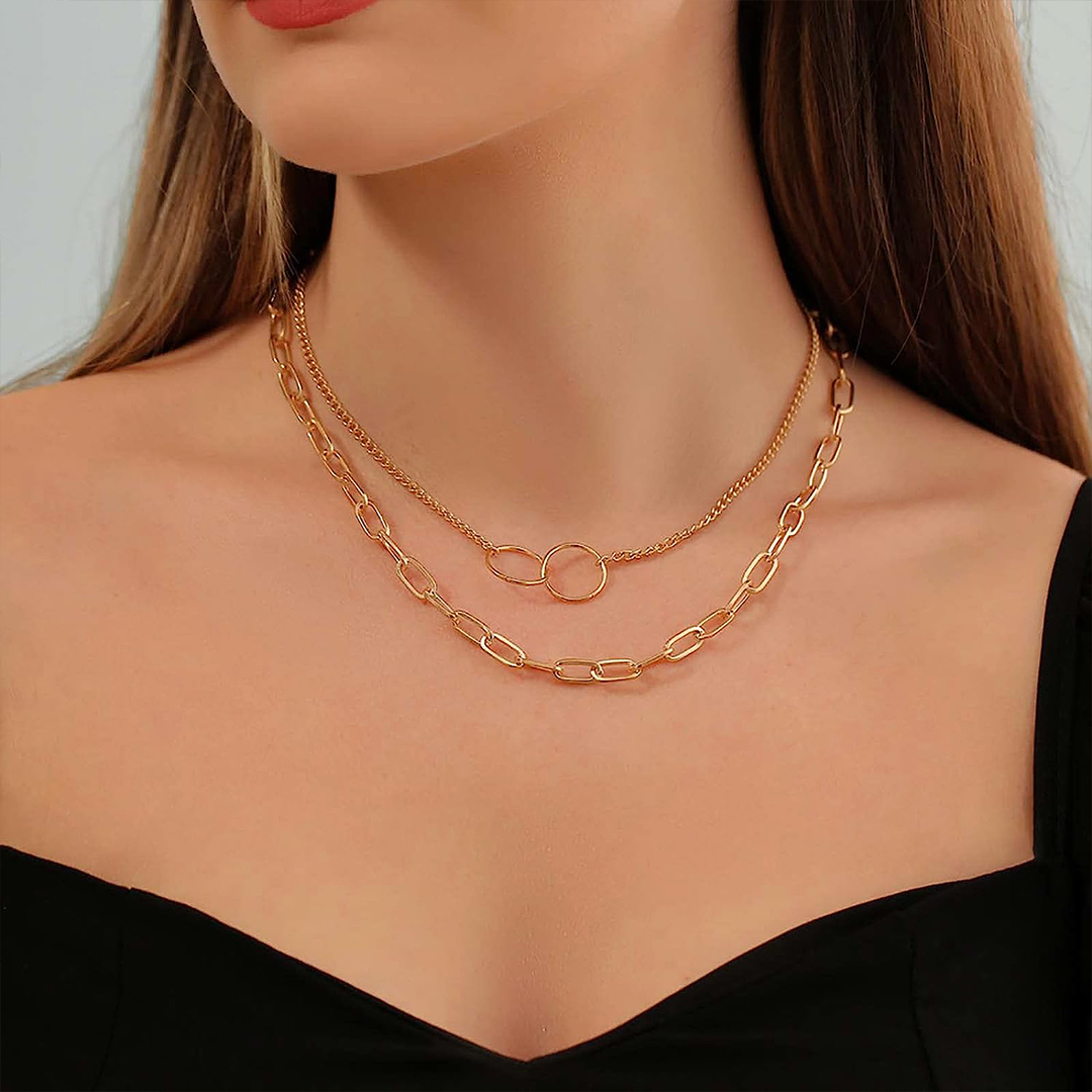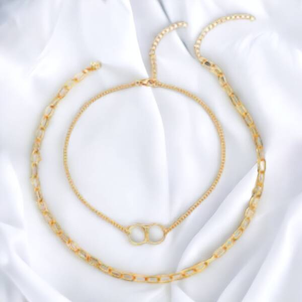 - Elevate your style with our stunning Gold Toned Double Chain Interwoven Necklace, a true testament to modern elegance and sophistication. This exquisite fashion jewelry boasts a harmonious fusion of contemporary design and timeless allure, making it the perfect statement piece for fashion enthusiasts seeking a touch of uniqueness.