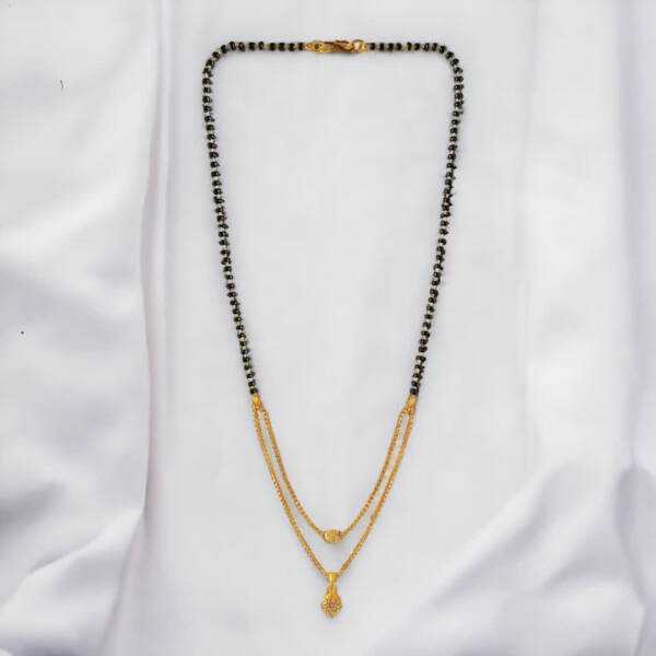 Modern mangalsutra ki new design has an exclusive traditional classy all-in-one look for the new woman. The double-layered mangalsutra gives a very chic look along with being traditional and in line with Indian culture. The chain is made of finest brass quality, which is skin-friendly, and has non-fading gold plating that makes the perfect accompaniment to this pendant. With a cute small heart-shaped pendant, it makes for the ideal present for your loved one while being able to be worn with both your traditional as well as western outfits. The black beads chain keeps the traditional look while the cute heart gives it a modern touch.