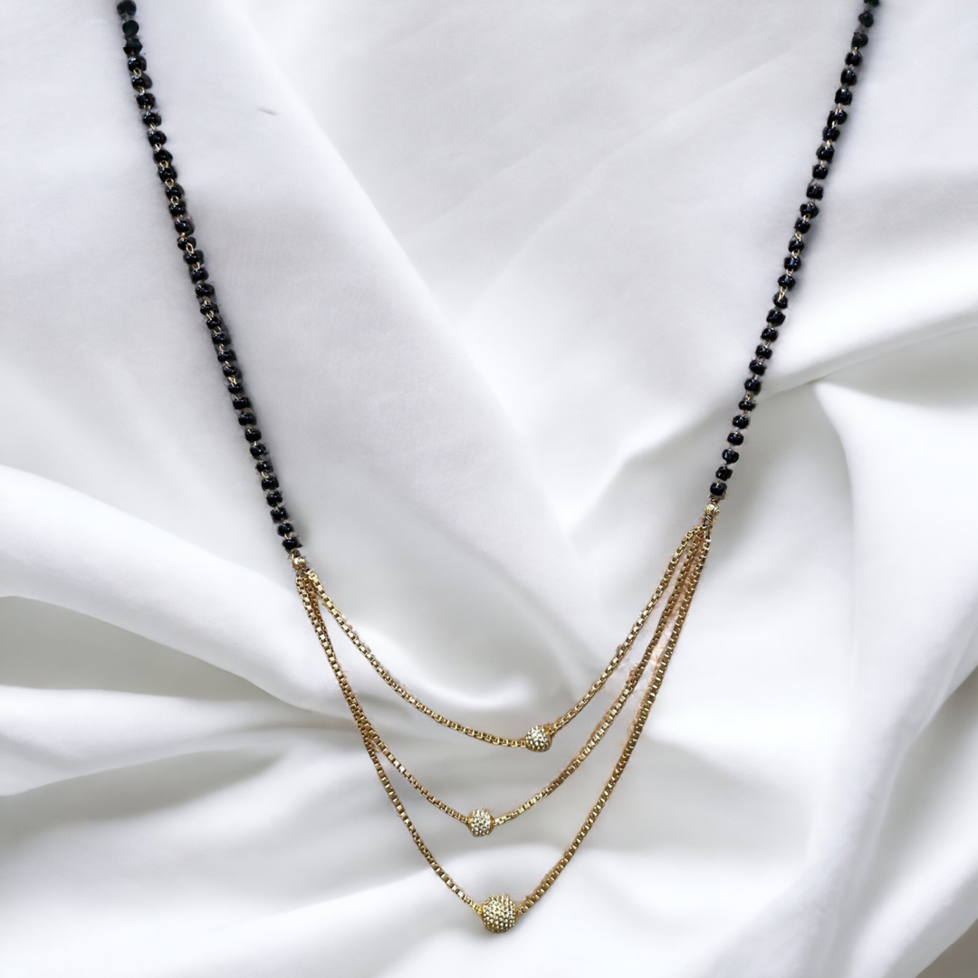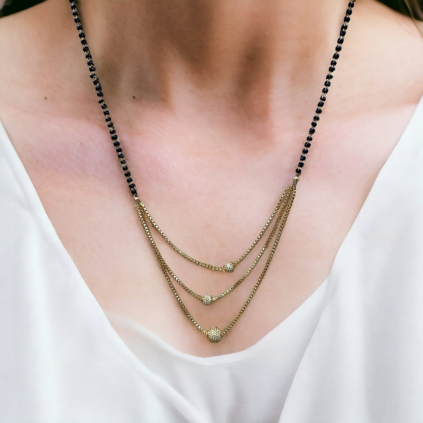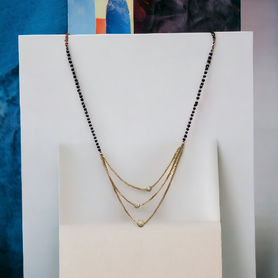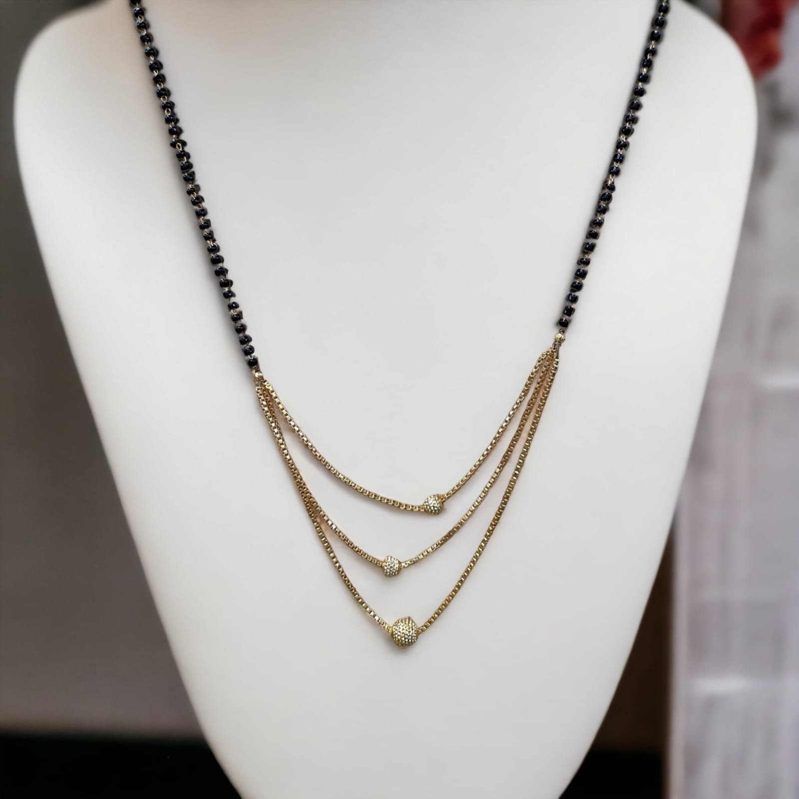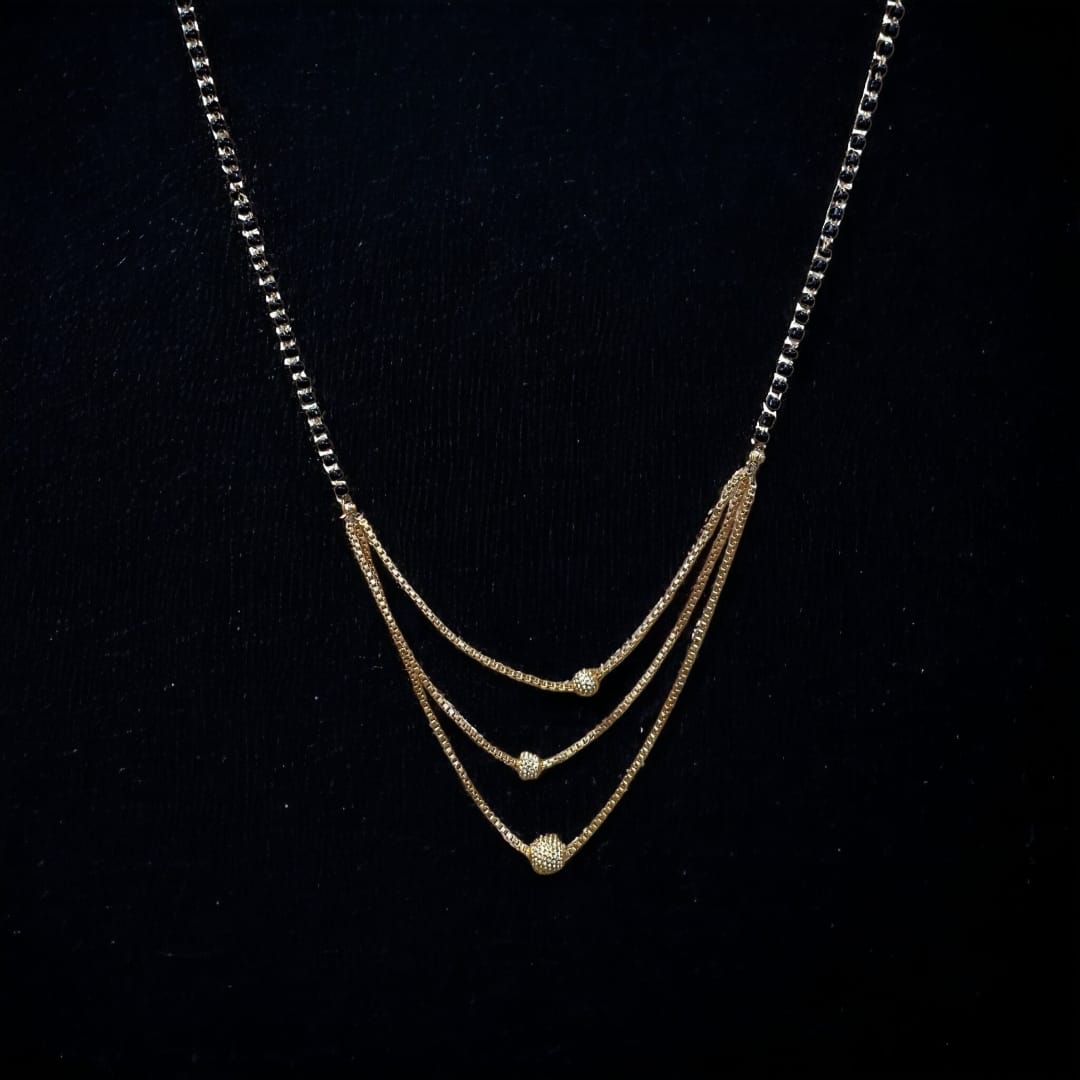 This triple layer mangalsutra new design is the latest trending design. It will look stylish with your ethnic wear, western wear, any occasion as well as work wear. The chain is of the finest brass quality and non-fading gold plating. With skin-friendly metal and small balls shaped embellishments, it makes a perfect gift for your loved one. It is a good choice for fashion-conscious women. The design with dancing cute balls is trendy and traditional all at once. This lovely piece will go well with any outfit, occasion, or work wear. The piece has an S-hook which makes sure that it remains in place. And the size is not too short nor too long.