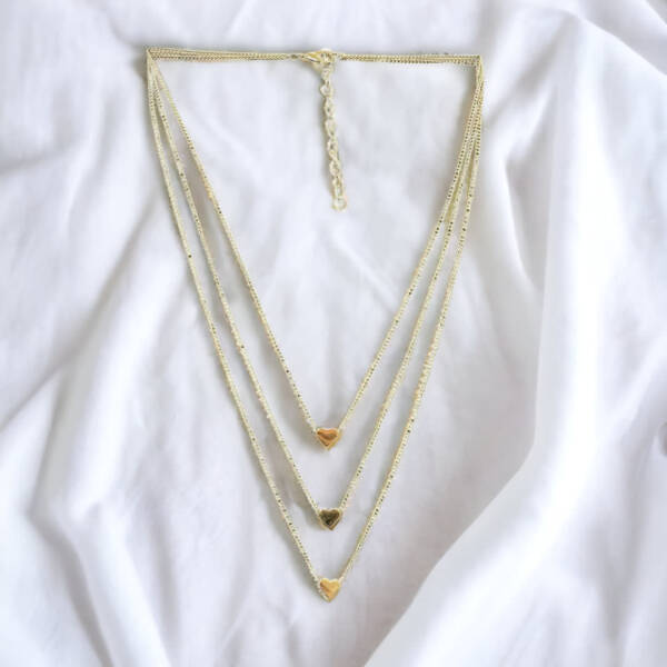 Multilayer necklace are the trend nowadays. This necklace has small cute hearts in delicate chains. The hearts are movable and seem as if they are dancing. We call them the dancing hearts.