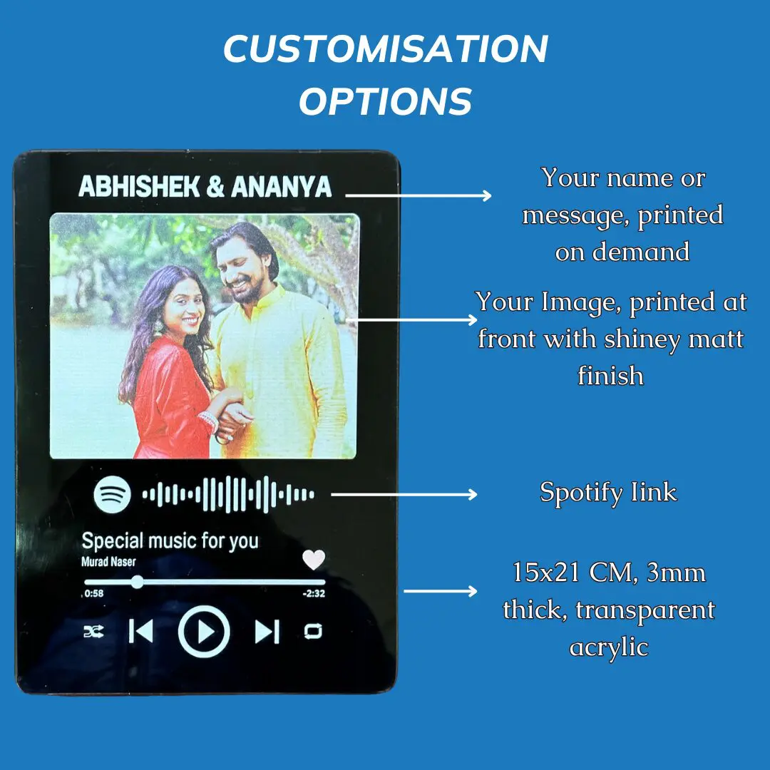 - Enhance your Spotify plaque with a personal touch using names, a special message, or an image, along with your favorite Spotify track.