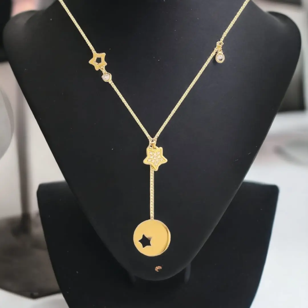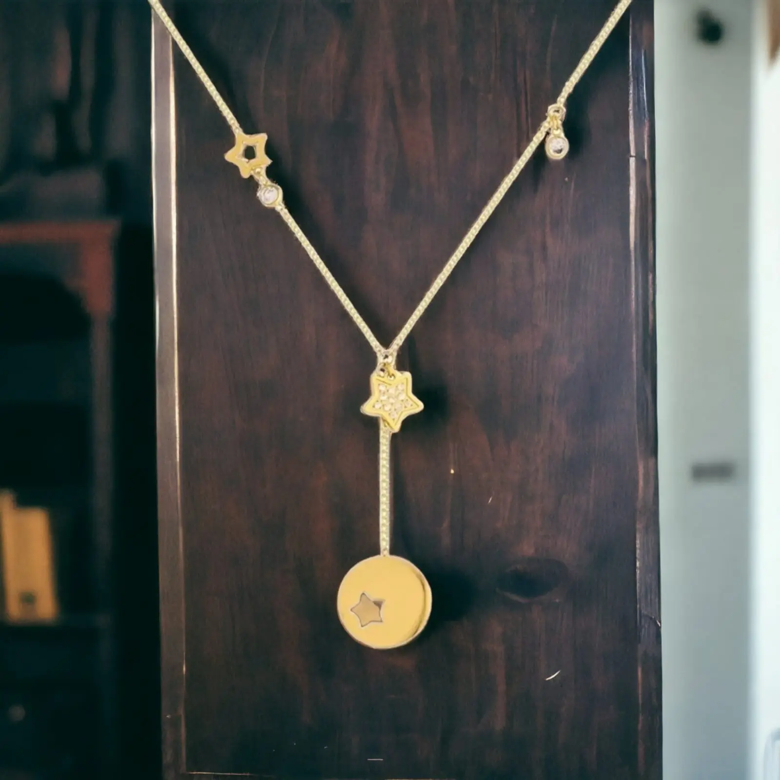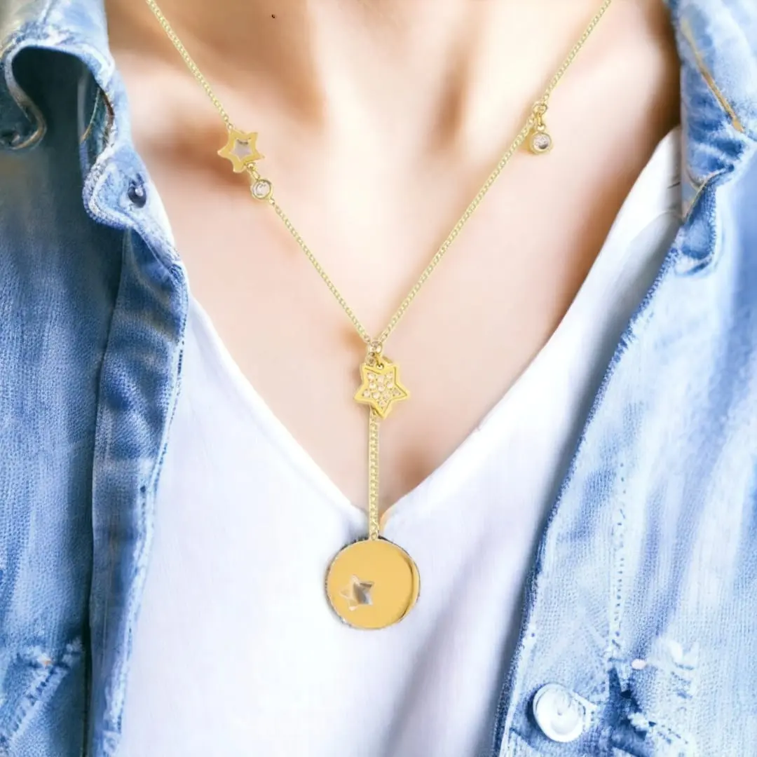 - Featuring a unique hanging pendant design, the main focal point of the necklace is a round coin with a star cutout. A dazzling star, studded with cubic zirconia stones, is positioned at the point where the pendant hangs, adding extra shine and elegance to the piece. On the right side, a small cubic zirconia stone charm dangles, while on the left side, there is a star cutout in the middle of the chain.