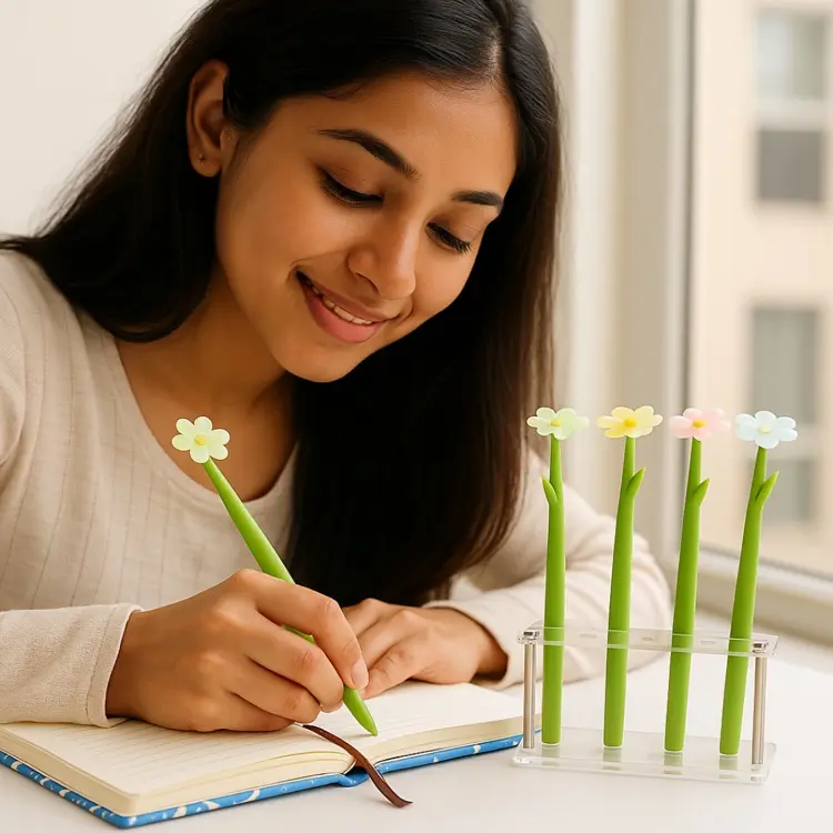 PREMIUM GIFT SET FOR WOMEN: Elegant stationery set featuring a soft cover journal, 5 decorative floral gel pens, and a stylish acrylic stand – perfect for journaling enthusiasts.