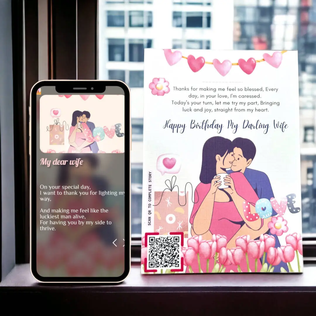 Celebrate the special day of your beloved wife with our heartfelt “Eternal Devotion” greeting card online. This exquisite card serves as a canvas for you to dedicate your unwavering love, care, and blessings to her on her birthday. Embedded within the card is a QR code that unlocks a beautifully crafted video message, allowing you to express your deepest emotions in a truly memorable way.